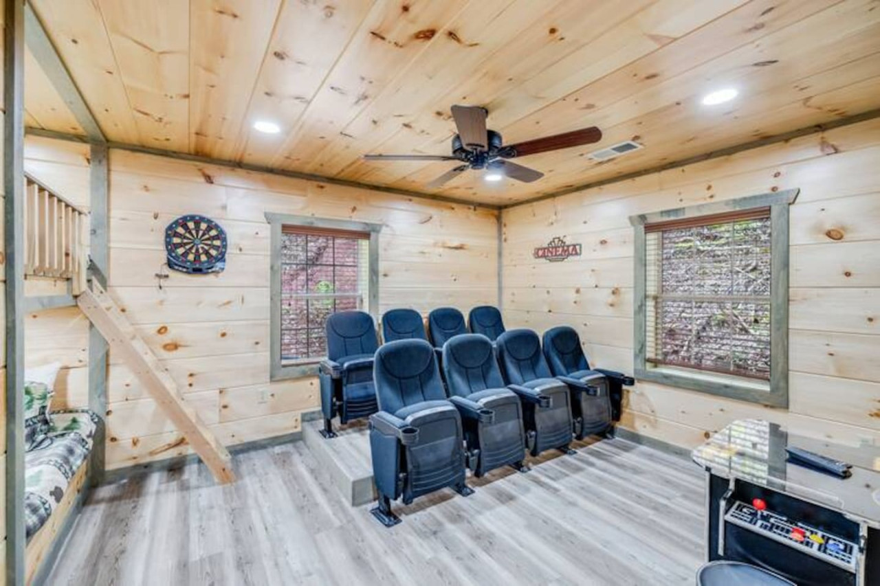 Newly remodeled and secluded cabin just minutes from downtown Gatlinburg. This charming single-level cabin features a well-equipped island kitchen, a coffee counter, a table for four, a relaxing living area with plush leather sofas, and a gas fireplace. The highlight of the interior is a kid-friendly bunk room with an eight-person home theater, a wall-mounted TV, and a cocktail table arcade game. This cabin isn’t just a place to stay; it’s an experience to cherish!