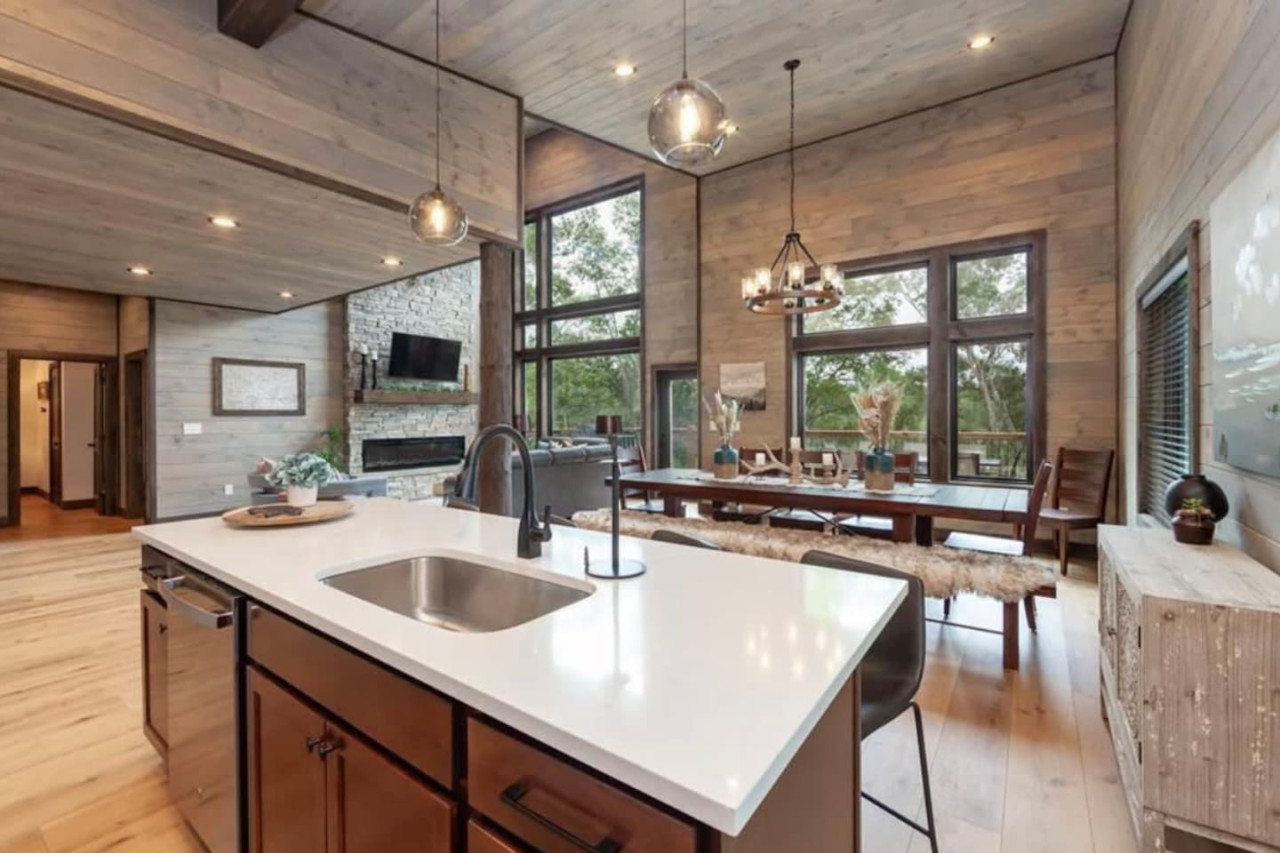 Enter the zero entry front door into a sky-high cathedral-ceiling great room with a wall of windows overlooking your 2 acres of forest below. Professionally designed, the living space’s focal point is a souring stone fireplace with a modern electric feature that can set the tone with the click of a button, creating a cozy yet spacious retreat for the whole family. Hand-stained tongue and groove walls and ceilings create a restful cabin-like space that perfectly frames the outside vista. Comfortable and stylish furniture allows ample relaxation by the fire, where the pull-out sofa bed can provide extra sleeping or movie watching. Take your coffee or nightcap out to the spacious deck and enjoy the breathtaking views of the mountains around Wears Valley. There is a generous gas-powered grill.