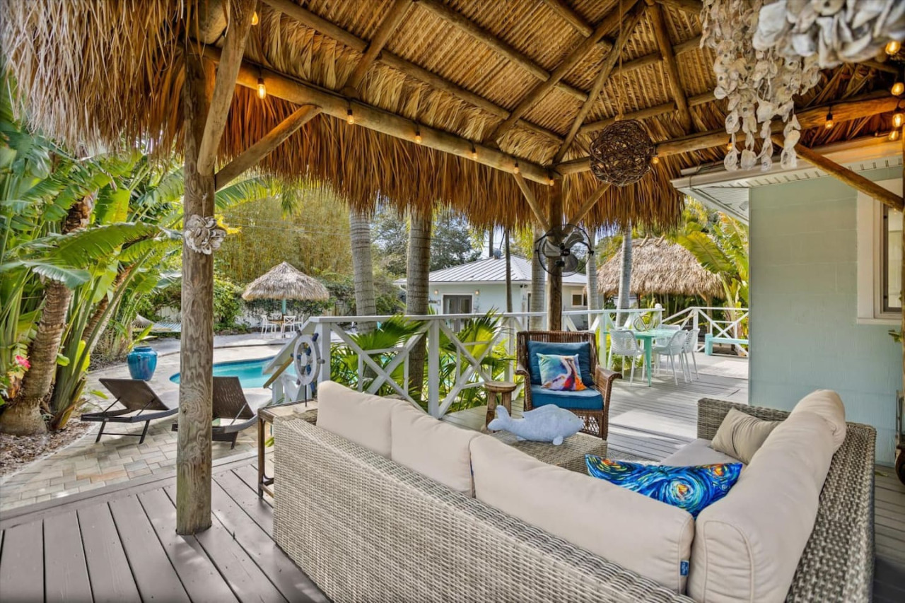 Come relax and unwind in this well-appointed, lushly landscaped, tropical Florida oasis. The main home is a classic 1,750 square foot, 2 bedroom/2 bath bungalow, that's been thoroughly and thoughtfully updated. It's complimented by a private and beautifully detailed 500 square foot, 1 bedroom/1bath guest home. Both structures overlook the courtyard and pool, whimsically framed by mature Traveler, Areca and Royal palms. The main home features a totally updated kitchen, luxurious master bath with walk-in shower, soaking tub and a walk-in closet. The guest bedroom of the main house has a queen bed and a well-appointed adjacent second bath with walk-in tile shower. The material selections are modern, yet timeless. You'll love the Florida decor, designed to be attractive, festive and comfortable. The guest bungalow has also been updated, reflecting the same quality and attention to detail as the main home. The outdoor spaces are abundant and dreamy places to pass the time. Like the back deck Tiki Hut with soft, sectional seating, the elevated dining table overlooking the pool and courtyard, poolside lounge chairs, Tiki hut with conversation table with upholstered swivel chairs, and the Tiki Bar on the sandy poolside "beach." Multi-generational travelers will appreciate the dedicated nursery in the guest house. Remote workers, streamers and gamers will love the efficiency of high-speed internet.